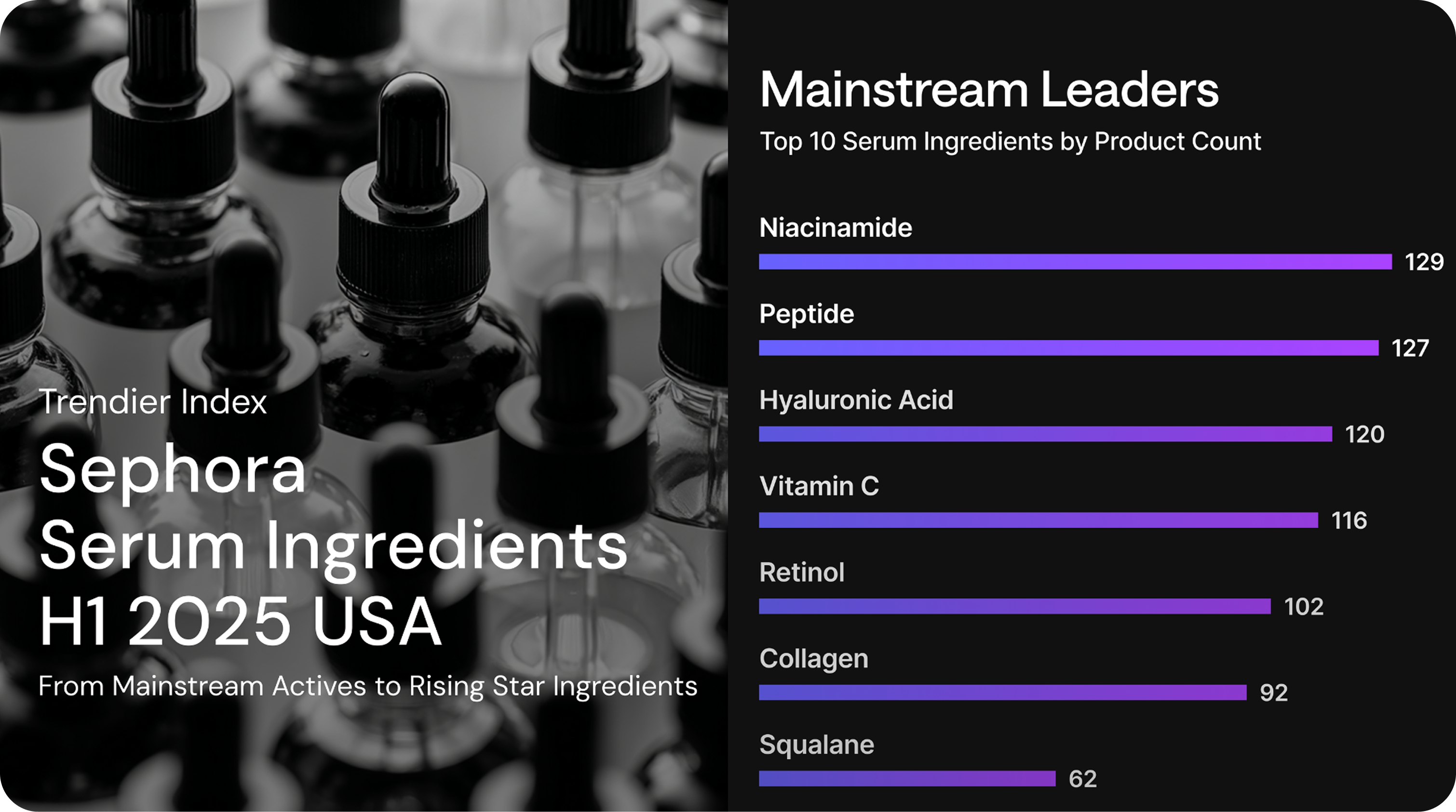 Niacinamide and Peptides continue to lead the U.S. serum landscape, featured in over 120 Sephora-listed formulas during H1 2025 — reflecting strong consumer confidence in proven, multi-functional actives.
