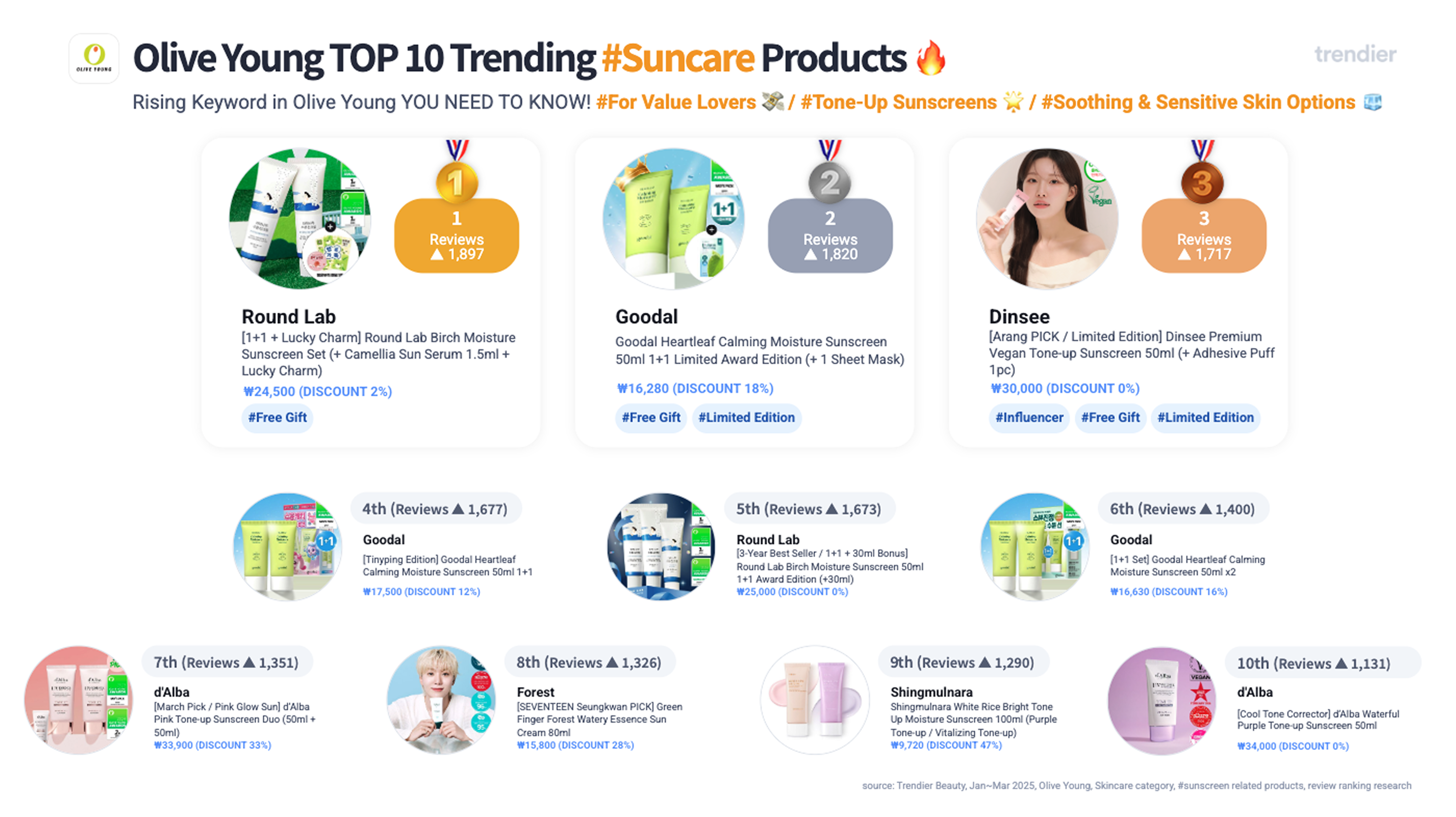 Suncare is rising globally, with Korea leading the momentum. In Olive Young’s latest rankings, Round Lab, Goodal, and Dinsee each earned over 1,700 new reviews, as hydrating, tone-up, and soothing formulas continue to drive strong consumer demand.
