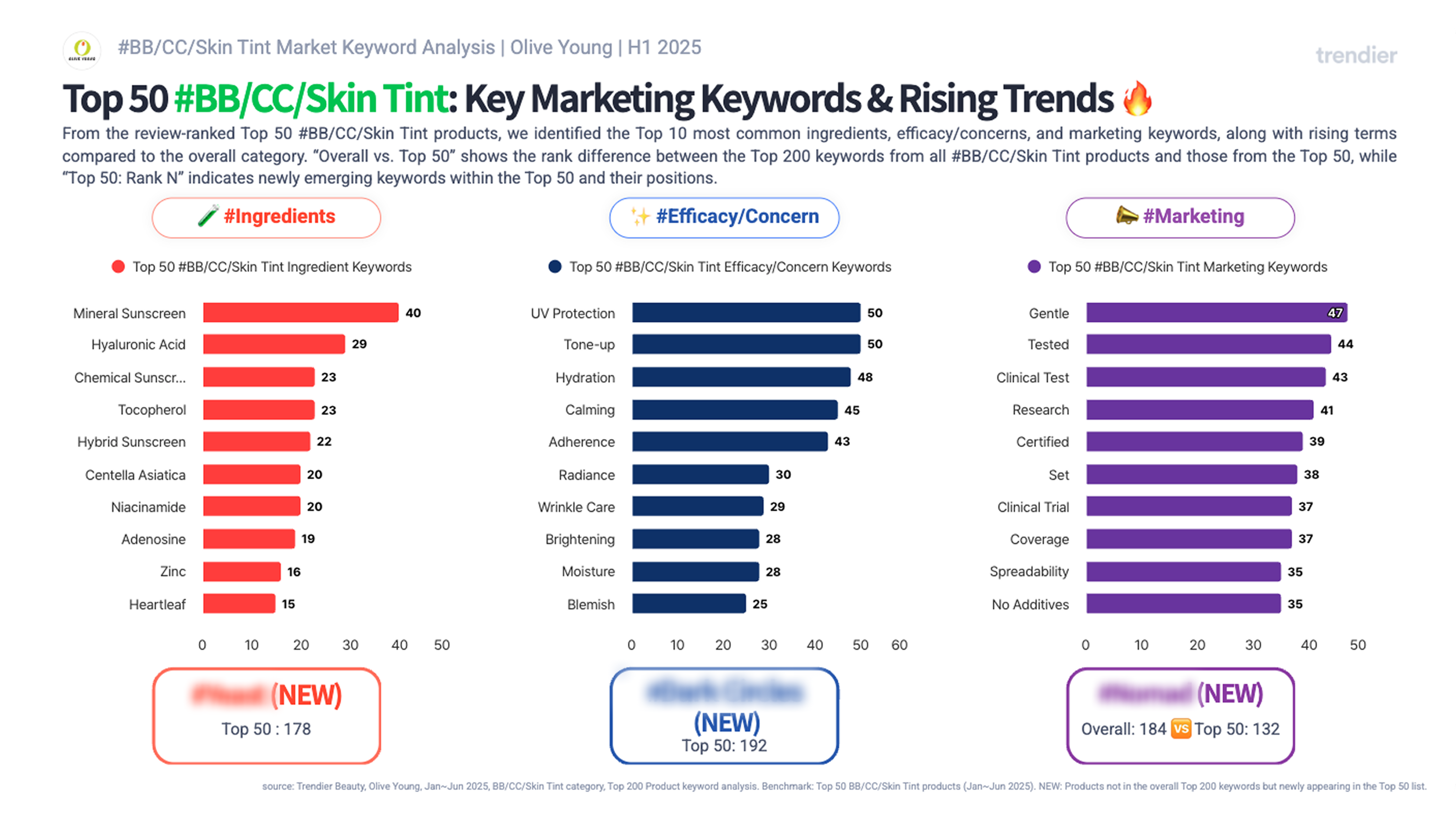 Olive Young’s H1 2025 data shows UV protection and hydration featured in nearly 50 top BB/CC Skin Tint products, with Ceramide, Panthenol, and Niacinamide emerging as key ingredients driving the rise of skincare-infused base formulas.