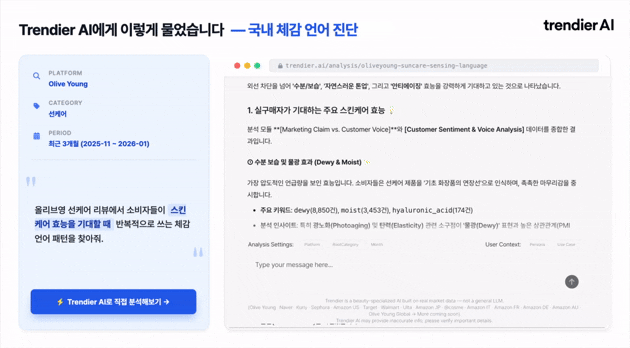 이처럼 국내 카피를 영문으로 옮기는 것만으론 글로벌 진출이 설득으로 이어지지 않기 때문에, trendier AI가 양국 소비자의 '체감 언어 패턴'을 비교 분석해드립니다. |