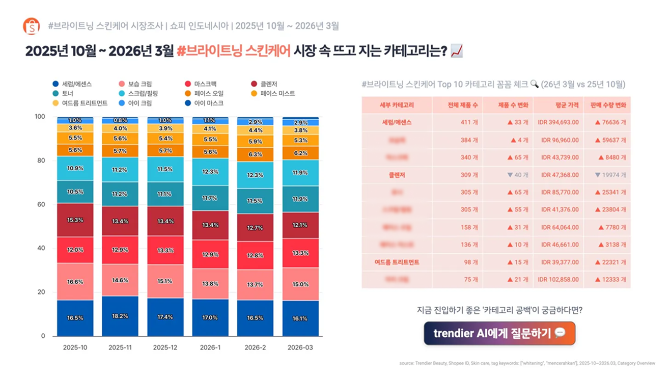 2025년 10월부터 2026년 3월까지, 동남아 주요 국가별 #브라이트닝 스킨케어 시장을 들여다봤습니다.