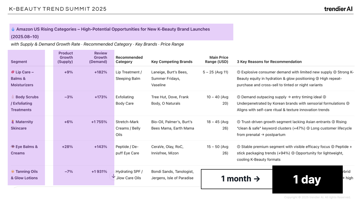 Today, leading K-Beauty organizations are breaking this cycle. They’re replacing manual workflows with Trendier AI, the first industry-specific system grounded in real-time data pipelines across 30+ global marketplaces (Amazon, Sephora, Olive Young, and more).