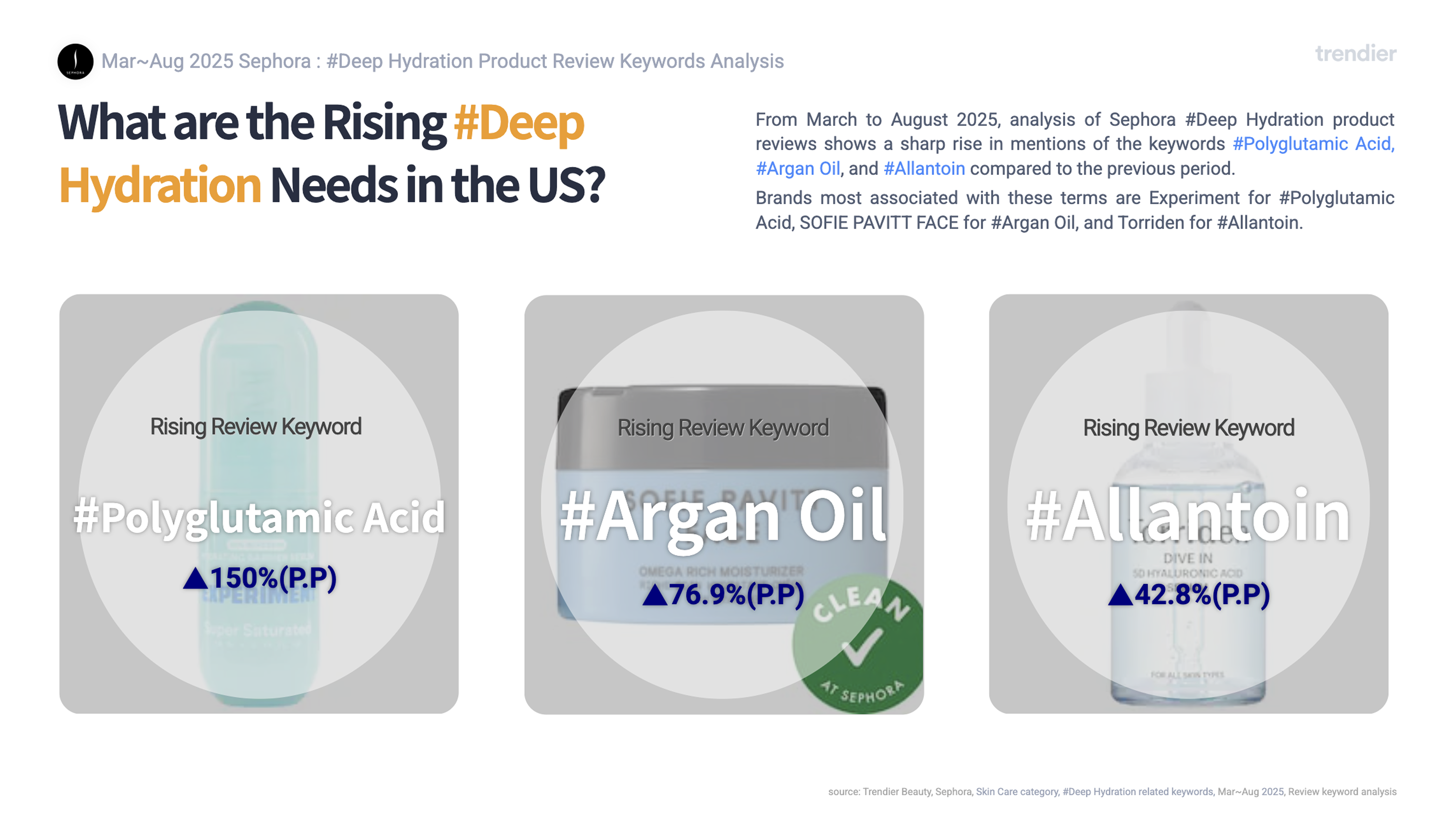 At Sephora U.S., deep hydration skincare is accelerating in demand. From March to August 2025, review mentions of #PolyglutamicAcid, #ArganOil, and #Allantoin climbed sharply, reflecting a shift toward barrier repair and long-lasting hydration.