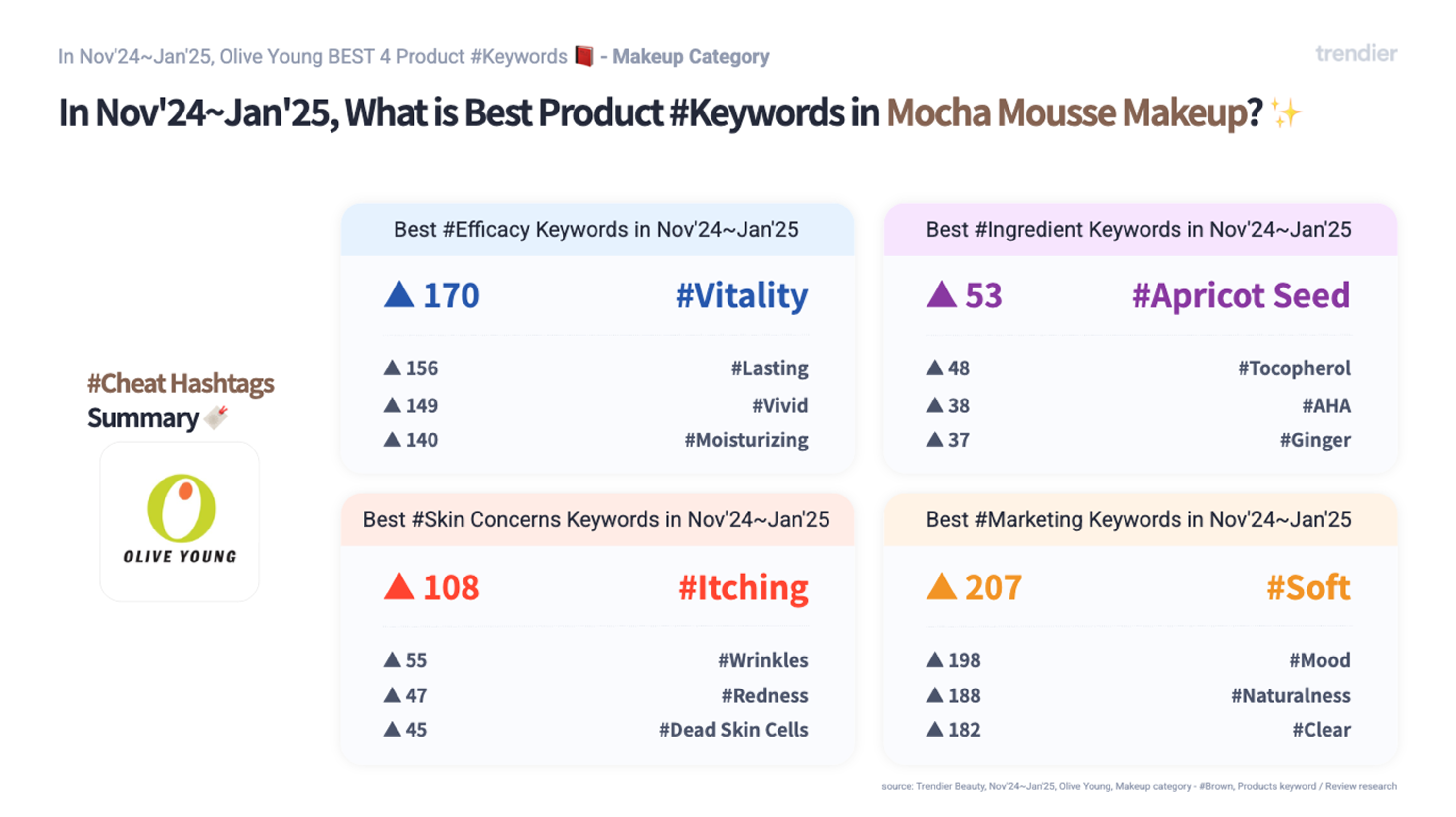 Mocha Mousse tones are trending in Korea, with #Vitality leading Olive Young’s top-ranked keywords from Nov’24 to Jan’25. Keywords like #ApricotSeed and #Soft reflect growing interest in natural, radiant finishes and skin-friendly textures.