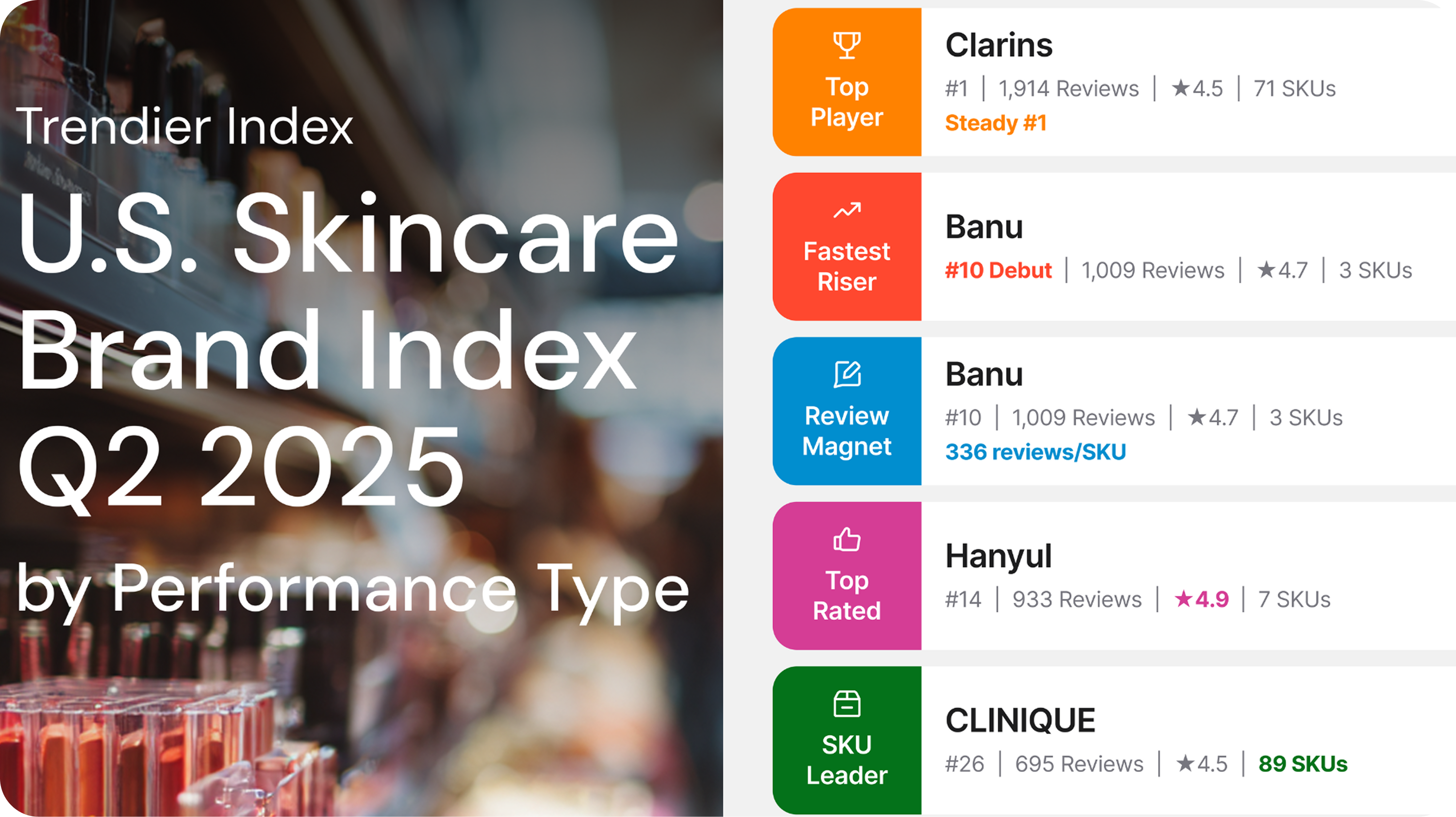 Based on the U.S. Q2 Skincare Brand Index, e.l.f. leads Ulta, Medicube secures the top spot on Amazon, and Banu dominates Sephora with 1,009 reviews, reflecting how accessibility, innovation, and data-backed performance are shaping the U.S. skincare market.