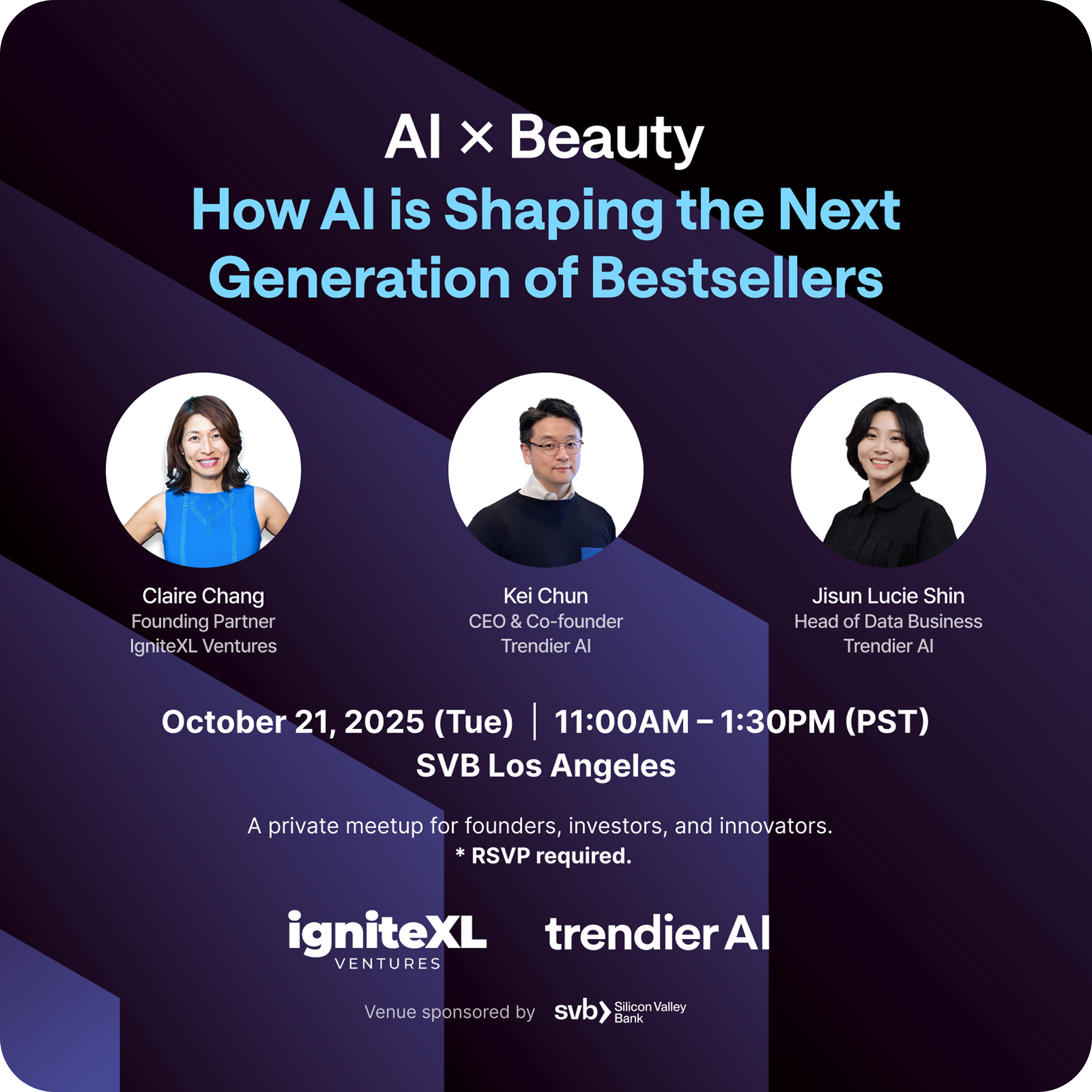 Trendier AI and igniteXL Ventures are co-hosting the AI × Beauty session on October 21 at Silicon Valley Bank, Santa Monica, featuring Claire Chang (Founding Partner of IgniteXL Ventures), Kei Chun (CEO & Co-founder of Trendier AI), and Jisun Lucie Shin (Head of Data Business at Trendier AI).