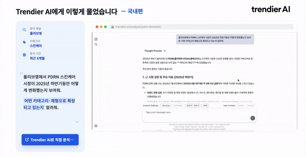 trendier AI가 시장 진단부터 기획 근거 마련까지 워크플로우를 자동화해 드립니다. |