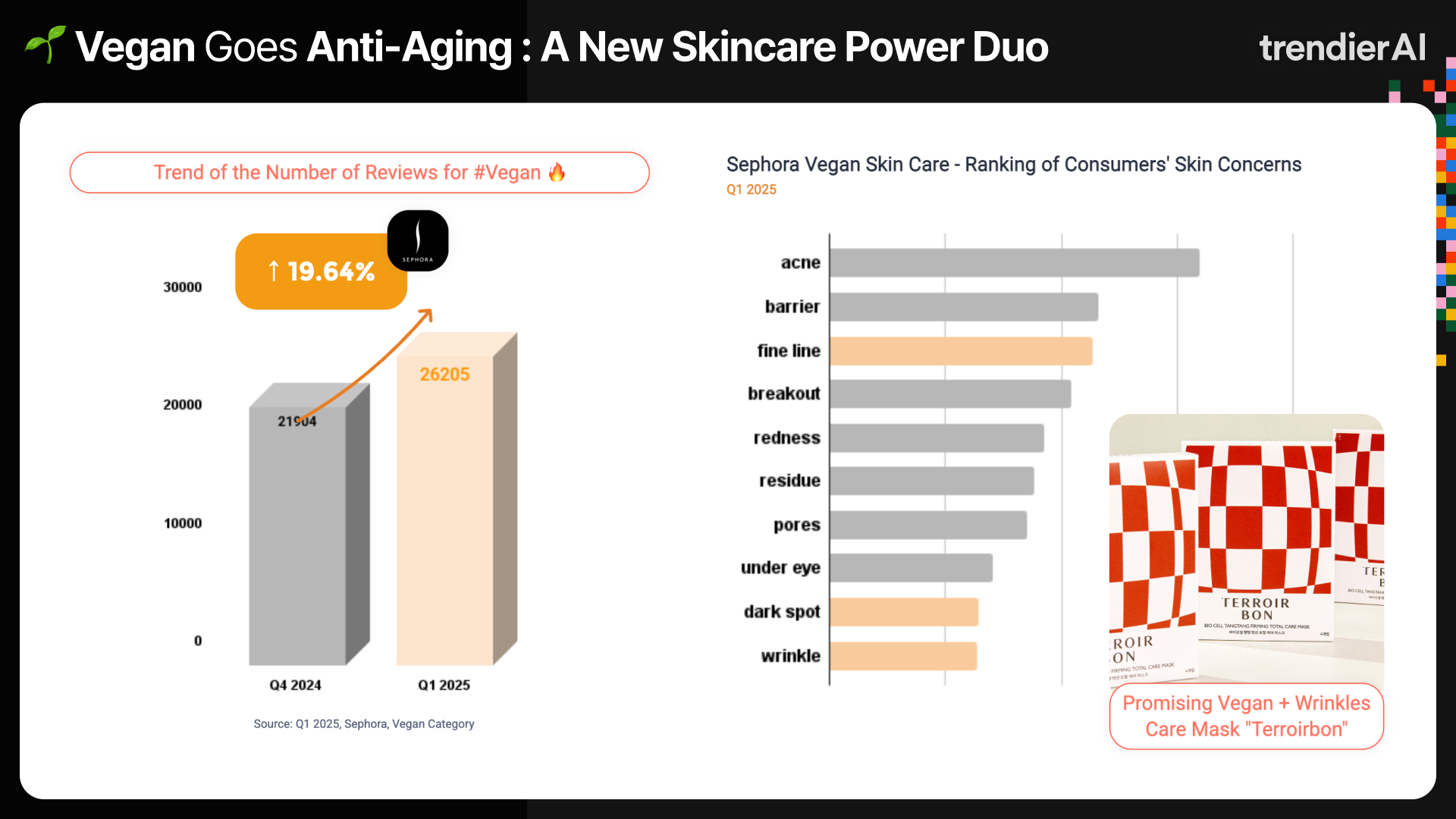 Aging-care demand is accelerating across Korea, Japan, and the U.S., as lifting, anti-aging, and firming keywords continue to rise. Even within the vegan category, interest in gentle but effective wrinkle solutions is growing, with #Vegan mentions at Sephora up +19.6% YoY, signaling a shift toward sensitive-skin–friendly anti-aging care.