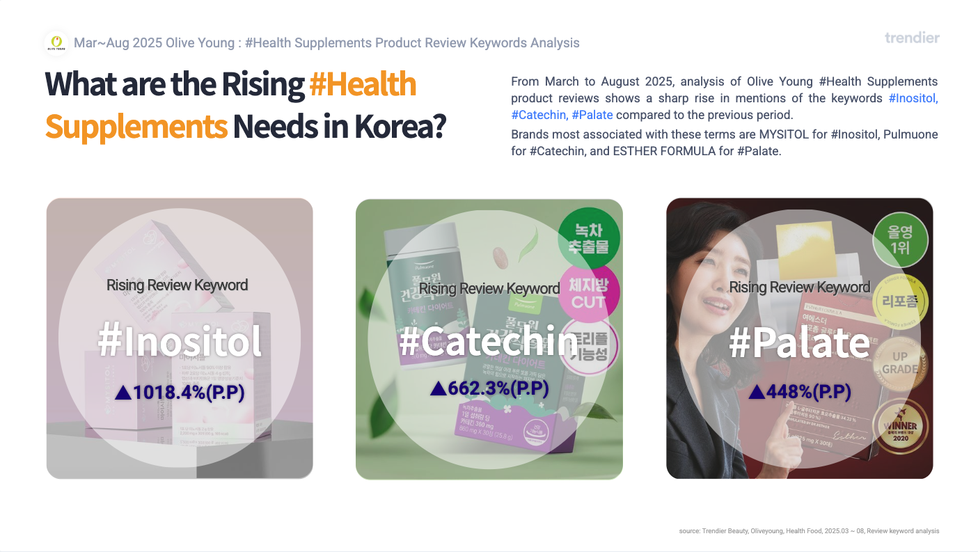 Inositol and Catechin now appear prominently across fast-growing products, while glutathione films are linked to rising terms like brightening and liposomal delivery, signaling strong pull toward efficacy-focused, format-innovative solutions.