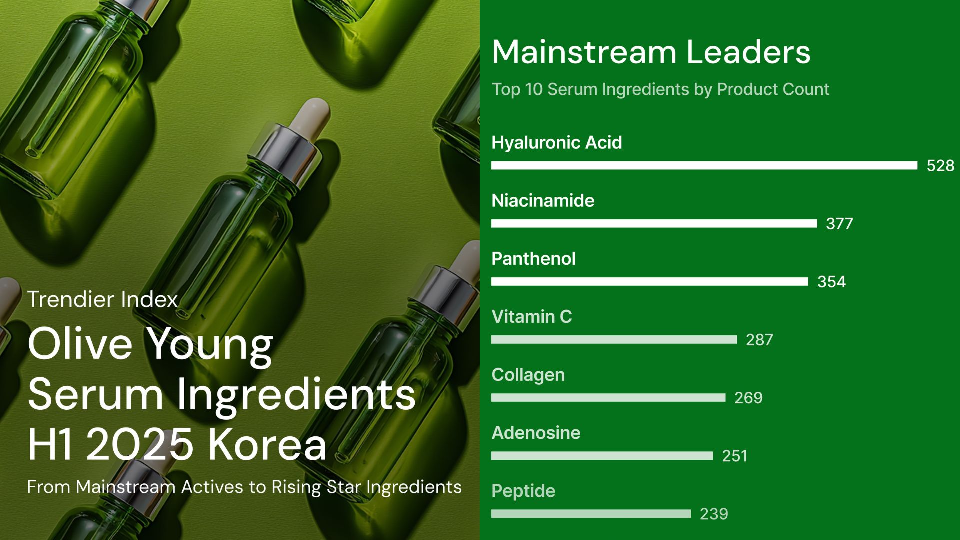 At Olive Young, Korea’s largest beauty retail platform, Hyaluronic Acid, Niacinamide, and Panthenol dominate the top serum ingredient rankings for H1 2025, reflecting K-Beauty’s continued focus on hydration, barrier repair, and functional efficacy.