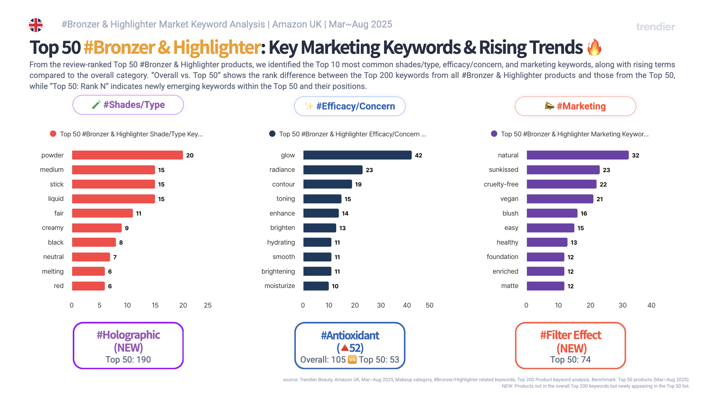 In Amazon UK’s bronzer and highlighter category, demand is shifting toward skin-enhancing finishes, with “glow,” “radiance,” and natural looks dominating reviews. Glow-related terms appear 40+ times in the Top 50 products, alongside trends like natural, sunkissed, and cruelty-free.