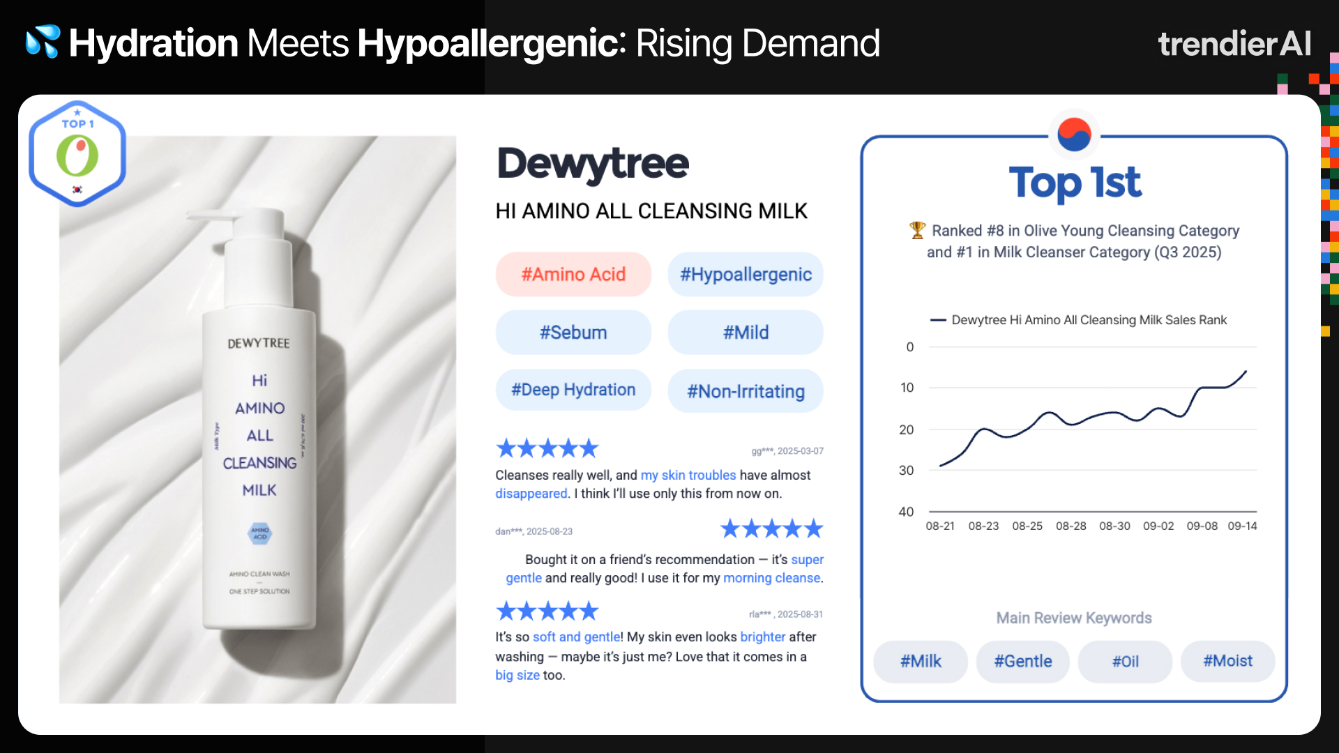 Demand for gentle, barrier-friendly cleansing is rising, with Dewytree’s amino-based cleansing milk gaining attention for its soft, non-tightening finish.