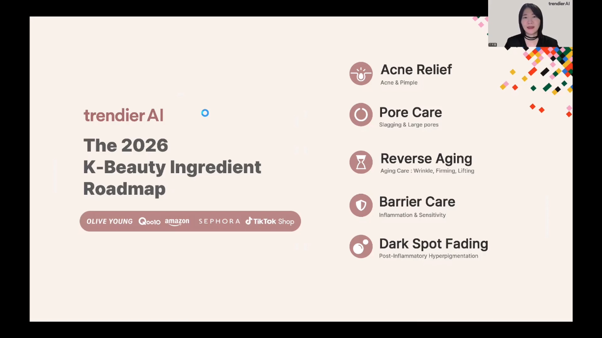 This week’s keynote, “The 2026 K-Beauty Ingredient Roadmap,” analyzes global review data from Olive Young, Qoo10, Amazon, Sephora, and TikTok to reveal the five key skin concerns defining 2026:
