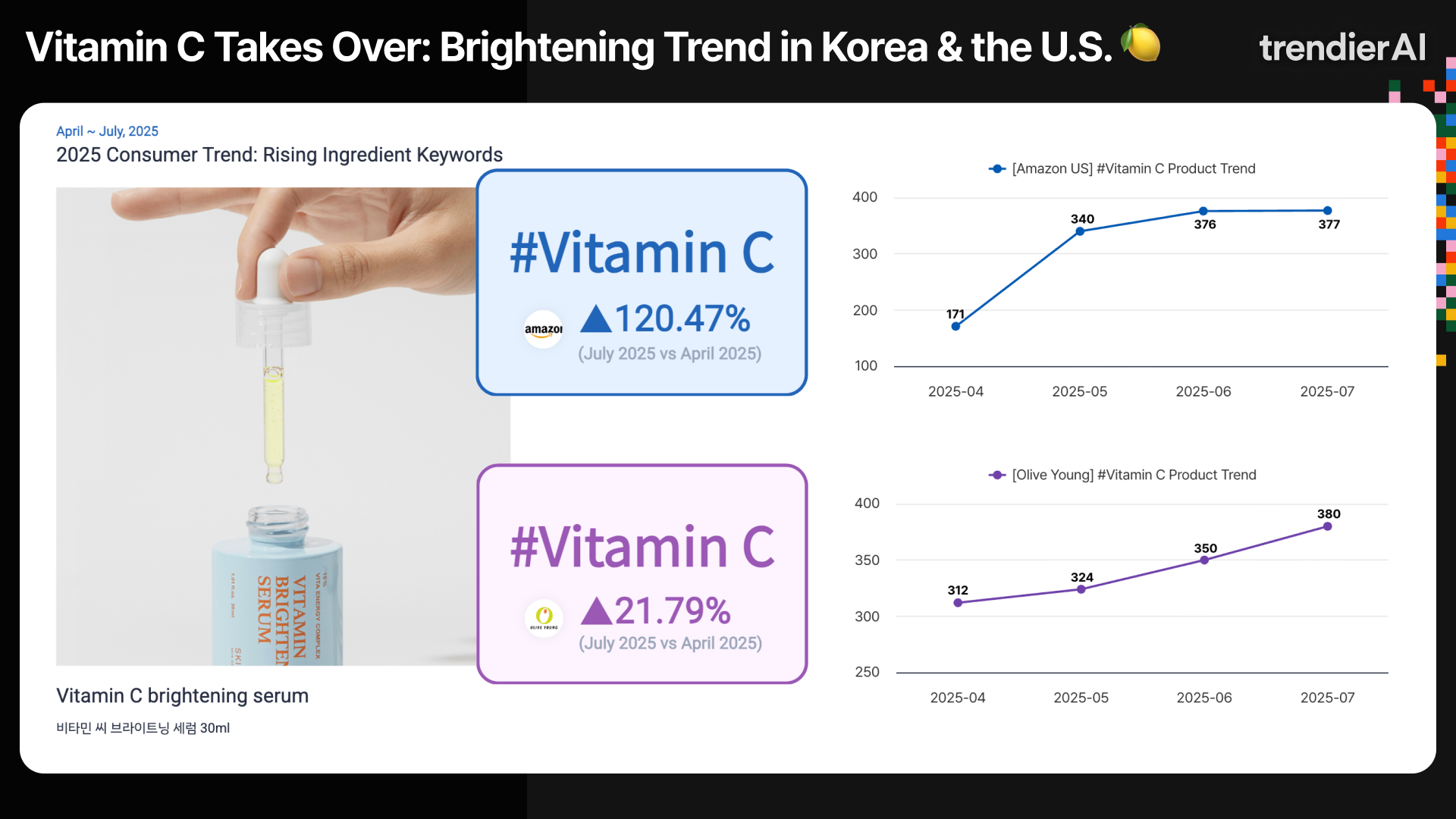 Vitamin C mentions are also up sharply (+120.47% on Amazon U.S., +21.79% at Olive Young), signaling stronger interest in bright, healthy skin.