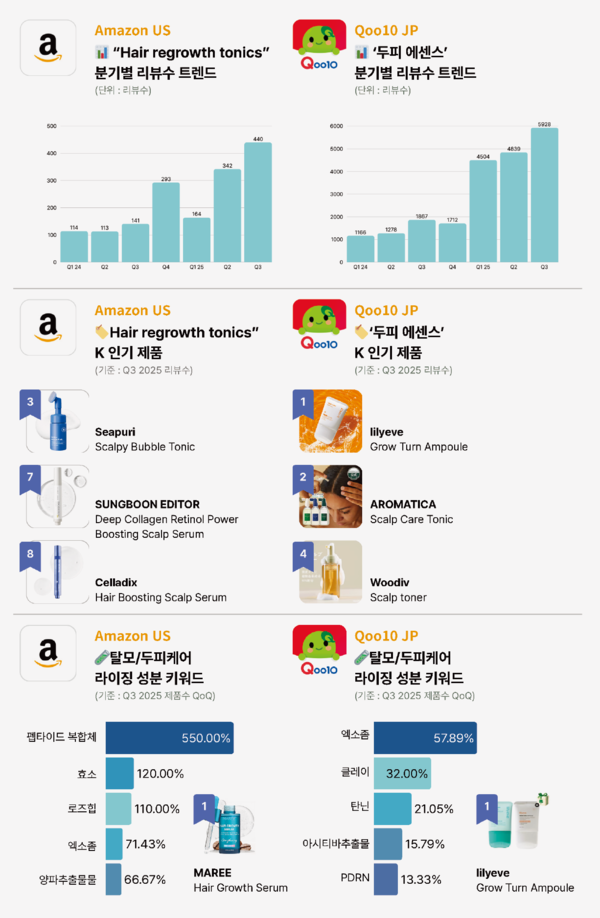 글로벌 이커머스에서 두피 앰플‧토닉 카테고리가 폭발적으로 성장하고 있다. Amazon US의 ‘헤어 리그로스 토닉’은 2025년 리뷰수 기준 전년 동기 대비 3.8배, Qoo10 JP의 ‘두피 에센스’는 5배 이상 급증했다. Qoo10 JP 톱10 전체가 한국 브랜드로 채워졌고, Amazon US 톱10 중 3개가 한국 브랜드다. 이 성장의 배경에는 ‘헤어 롱제비티(Hair Longevity)’ 트렌드가 있다. K-뷰티는 탈모 치료제가 아닌 두피의 노화를 예방하는 안티에이징 솔루션으로 포지셔닝하며, 스킨케어 노하우를 두피에 적용한 ‘스캘프 스킨케어’로 카테고리를 리드하고 있다.