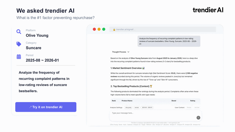 The retinoid reset is a structural shift in the Korean skincare market where retinoid products are being repositioned from basic anti-wrinkle treatments to high-efficacy, daily-use slow-aging formulations built around elasticity, moisture, and gentle delivery. According to trendier AI's review volume tracking of Olive Young (South Korea), retinoid-related reviews