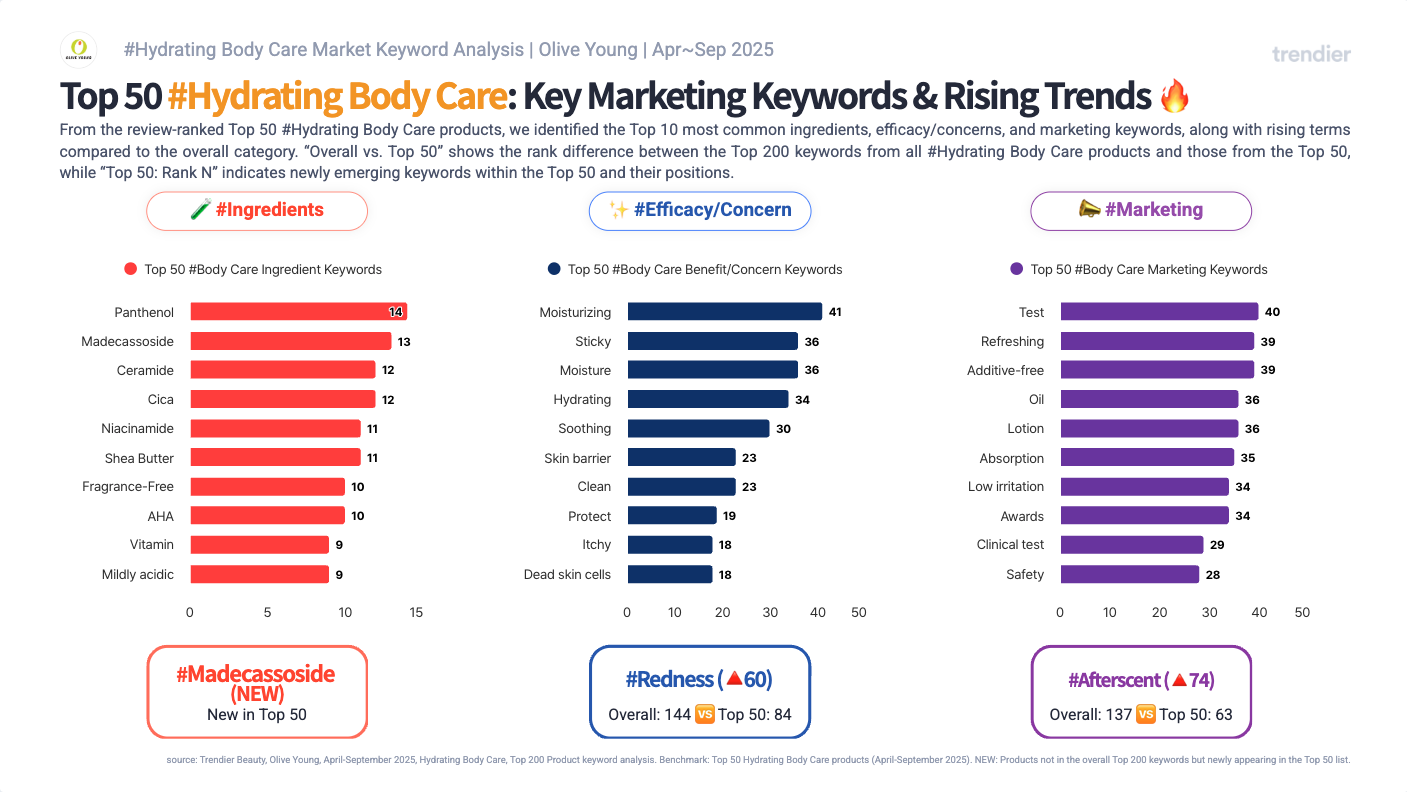 Hydrating body care demand is climbing, with barrier-repair and deep hydration formulas leading performance. Ceramide, cica, panthenol, and madecassoside appear across top products, supported by growing interest in soothing and redness-recovery benefits.